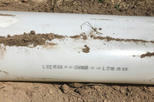 Single-use lay flat pipe is unrolled across the field, and holes are punched along the pipe to allow water to flow into the furrows between the rows. A length of pipe can be as much as 1,300 feet long, so managing water flow throughout that length is important.