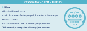 The easiest way to figure pumping costs is to use the following equation for kWh to pump 1 acre foot of water. An acre foot is approximately 325,851 gallons of water, or it can be described as pumping 1 acre 1 foot deep. Most crops require anywhere from 1 to 5 feet of water per acre annually, so this example makes sense. The following equation helps clarify this point: