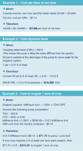 The easiest way to figure pumping costs is to use the following equation for kWh to pump 1 acre foot of water. An acre foot is approximately 325,851 gallons of water, or it can be described as pumping 1 acre 1 foot deep. Most crops require anywhere from 1 to 5 feet of water per acre annually, so this example makes sense. The following equation helps clarify this point: